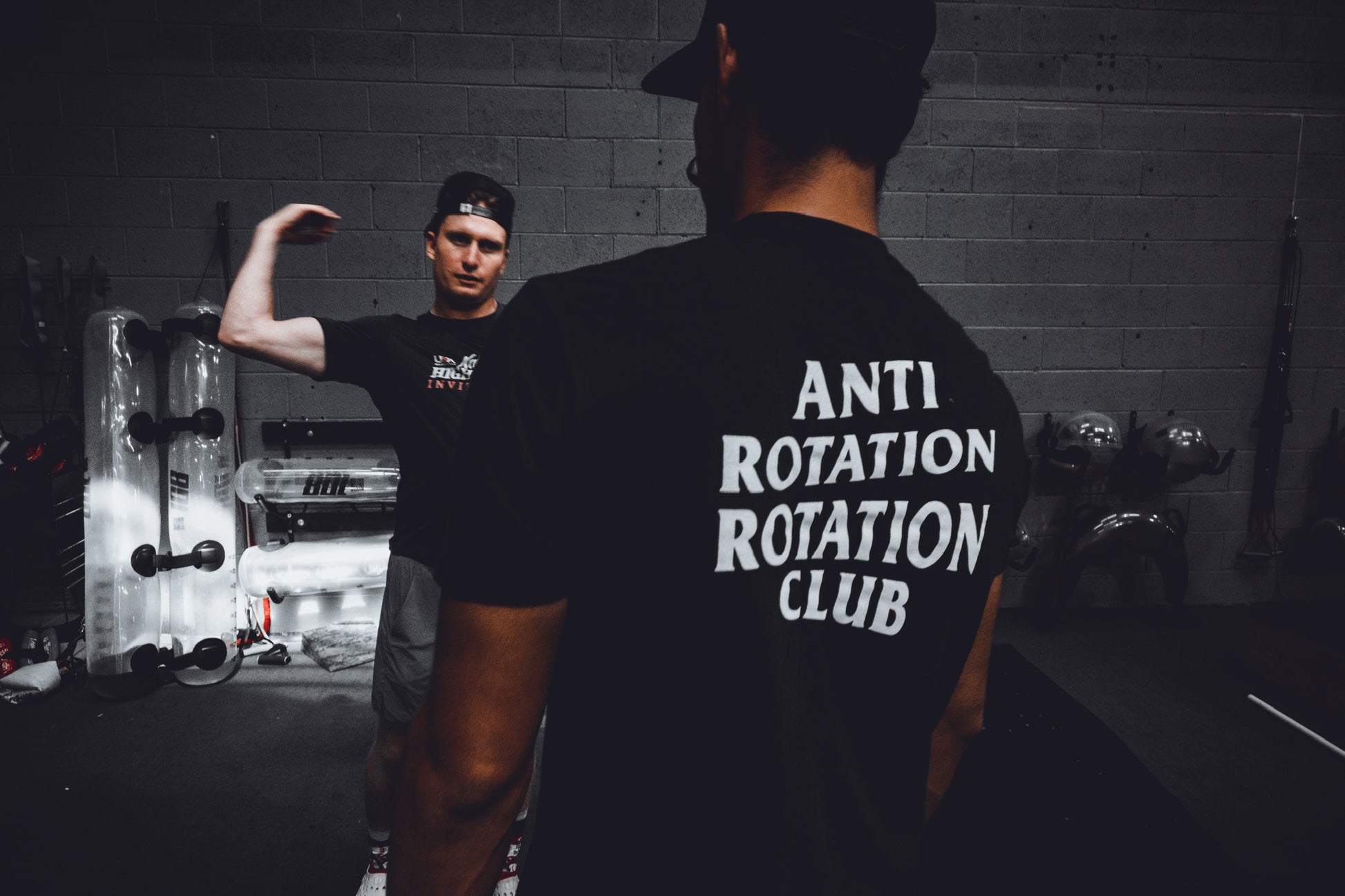 Expertly crafted with 60% cotton and 40% polyester, it boasts a unique small Anti Rotation Rotation Club graphic on the front and a large Anti Rotation Rotation Club on the Back on a Black T-Shirt . Experience superior comfort and style with this one-of-a-kind tee.